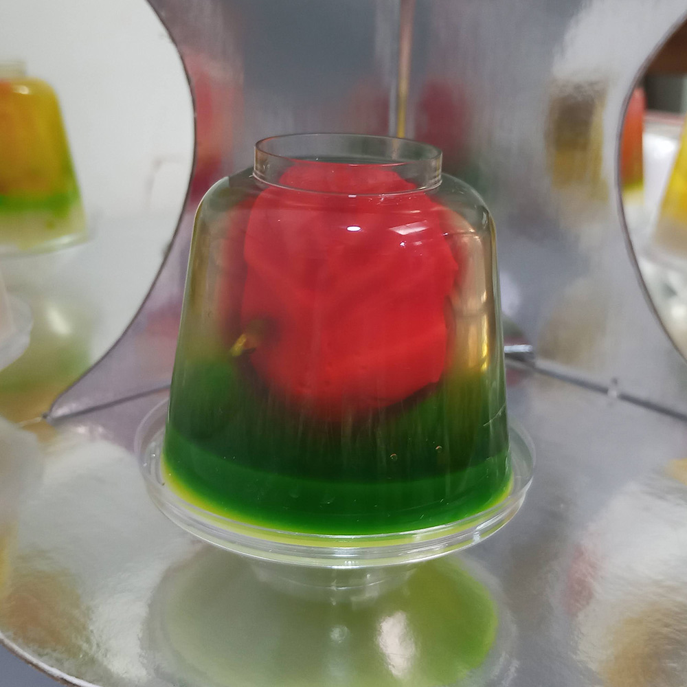 Postre de gelatina, base transparente sabor maracuyá con diseño de gelatina en leche