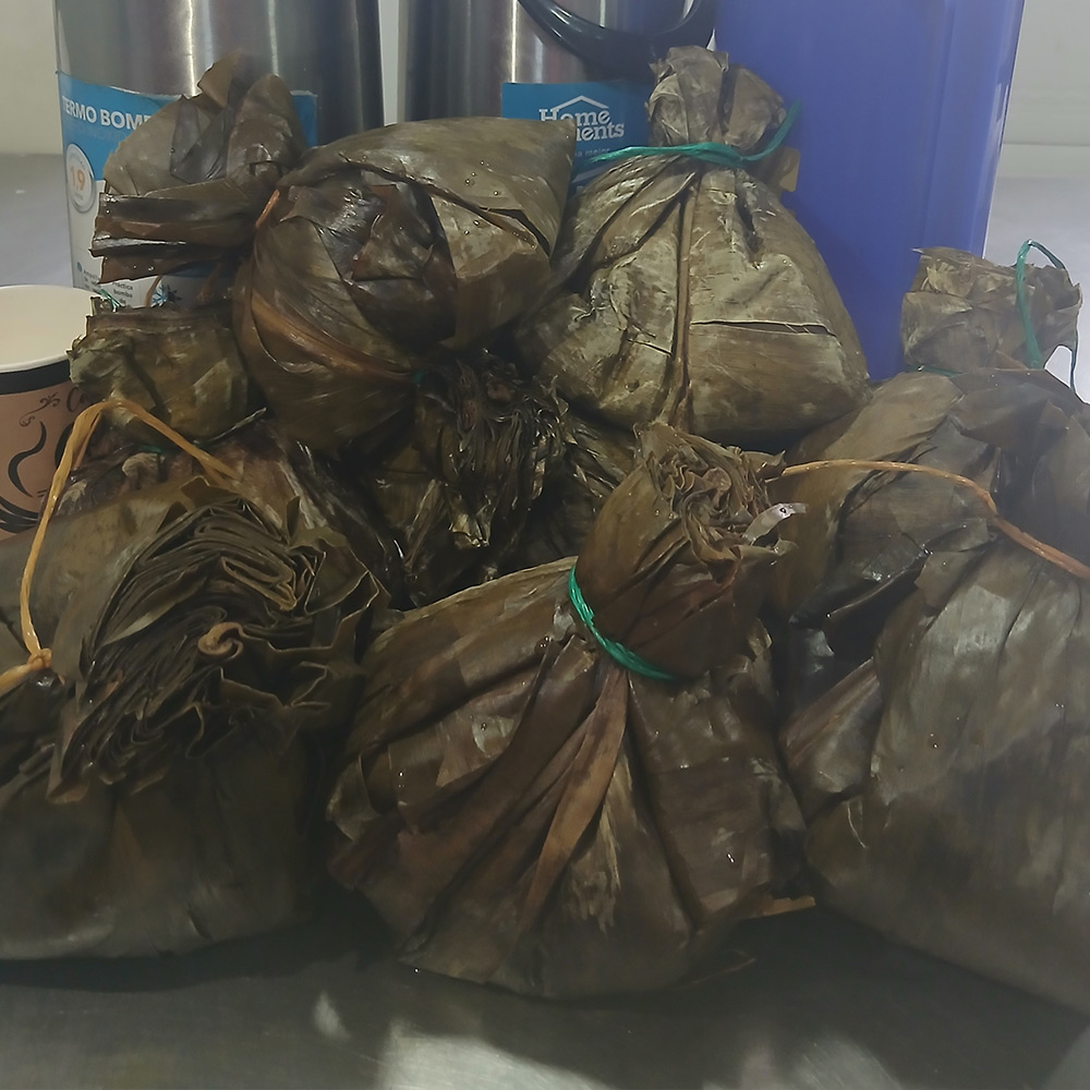 Tamal tolimense, chocolate caliente, porción de queso, pan mantequilla